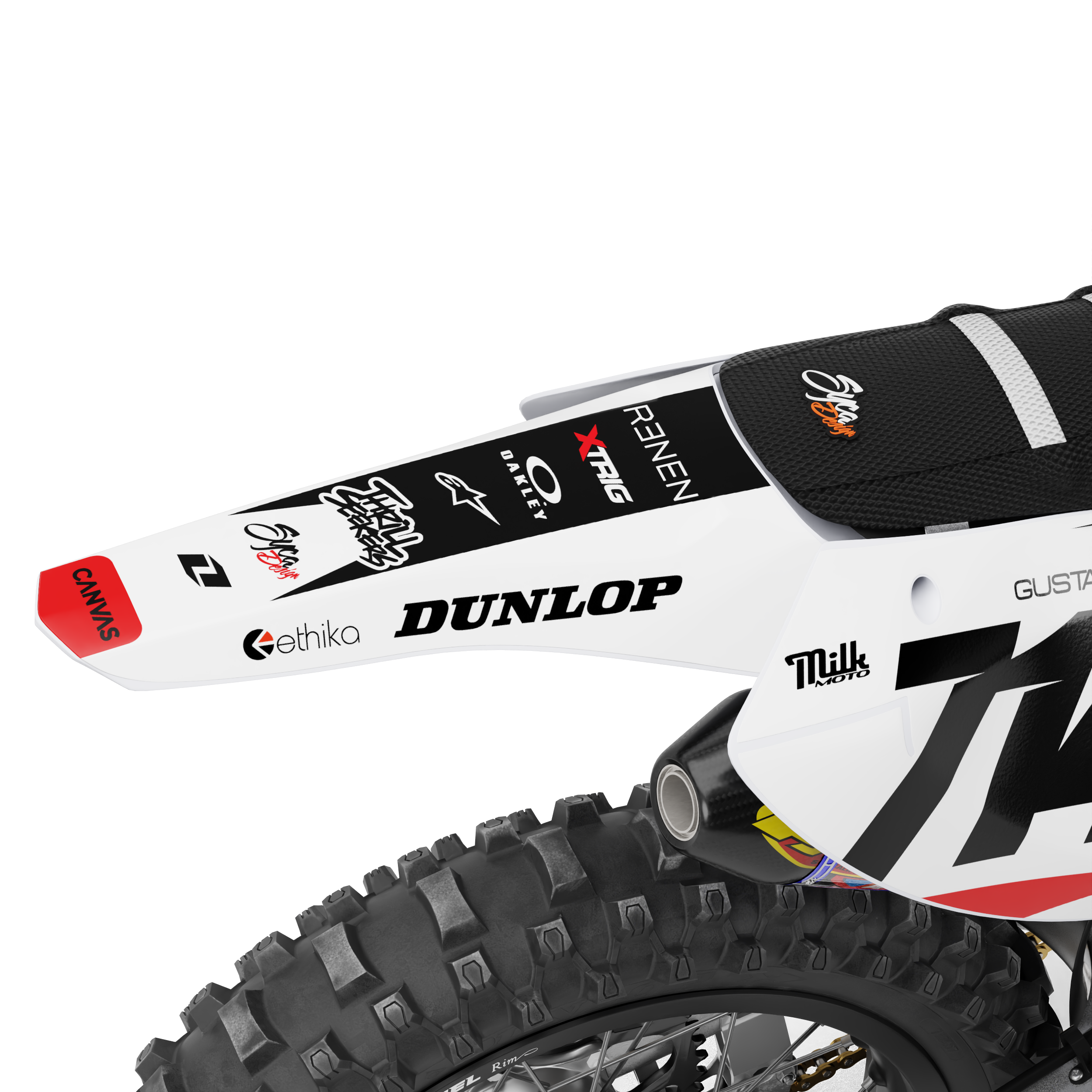 Trimset bevat de volgende stickerdelen: Voorspatbord, achterspatbord, voorvorkbeschermers en achterbrug.